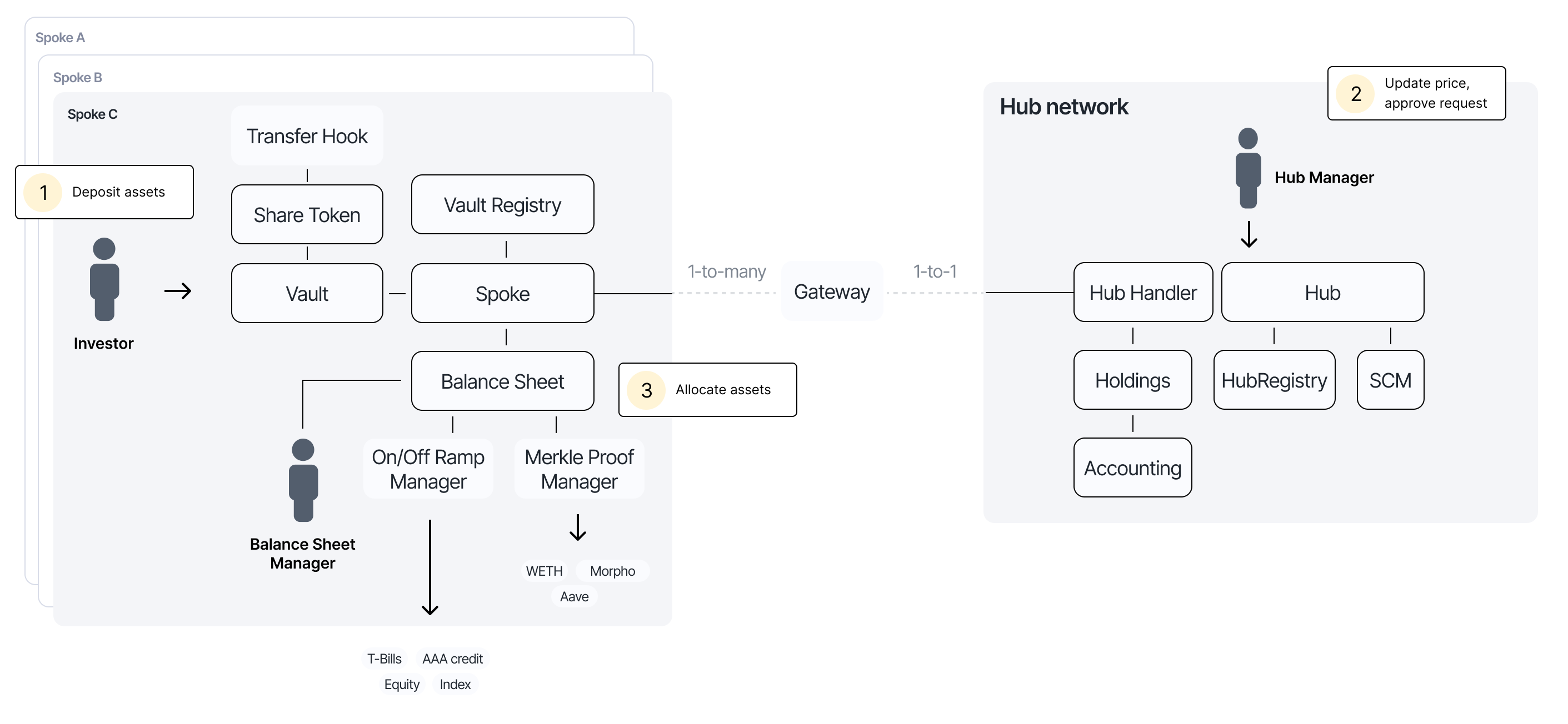 Spoke chains provide the tokenization and distribution layer where end users interact with the protocol. Each spoke deploys ERC-20 share tokens that are customizable with transfer hooks for compliance and restrictions. Both ERC-4626 and ERC-7540 vaults can be deployed for seamless DeFi integration, with multiple vaults supported per share class to accept different payment assets.